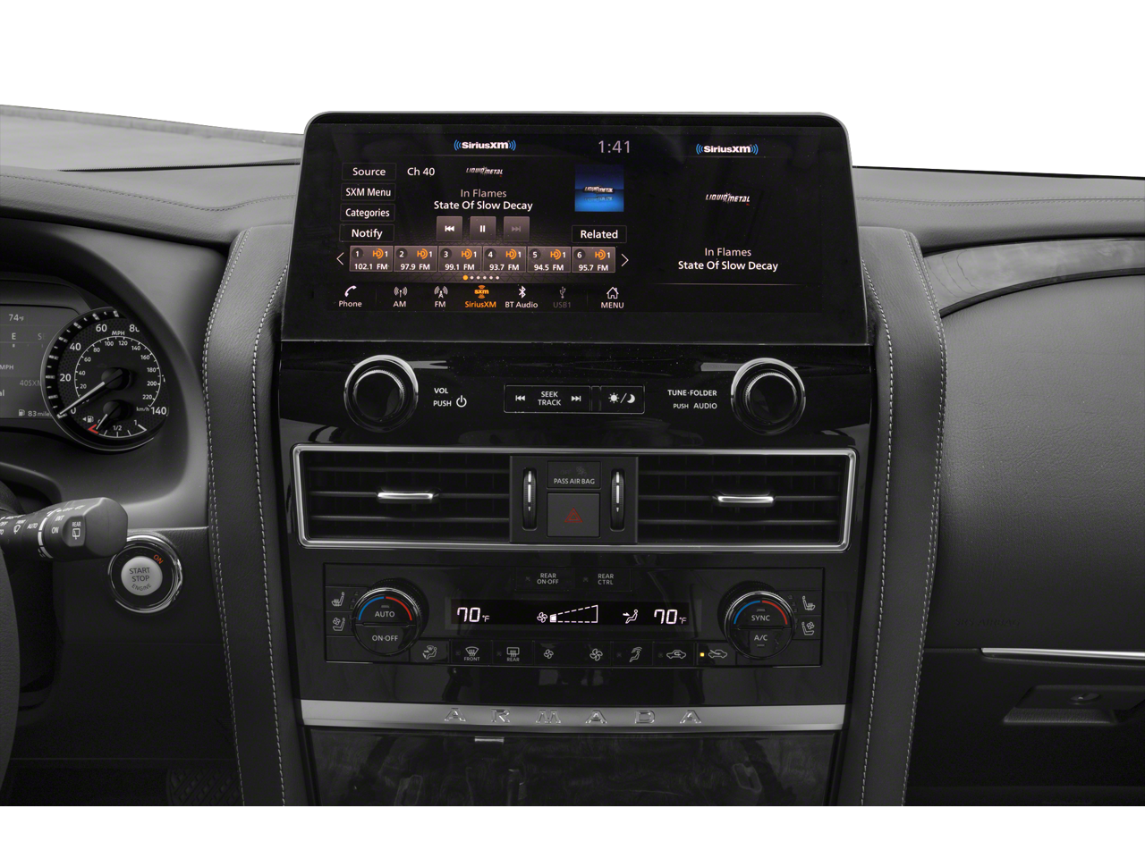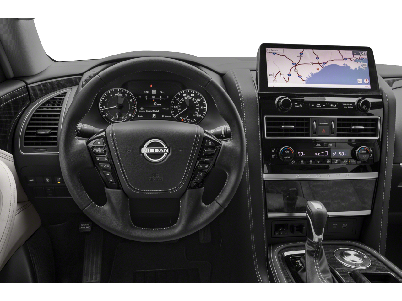 The Armada Platinum's interior is a true masterpiece, blending premium materials and cutting-edge technology to create a cabin that is both luxurious and functional. Indulge in the comfort of quilted leather seating, heated and ventilated front seats, and a heated steering wheel. The 13-speaker audio system and NissanConnect infotainment system with SiriusXM keep you entertained and connected on every journey.